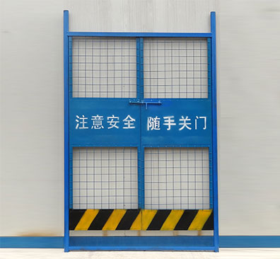 汉坤人货电梯防护门全铁板上下冲孔,带角钢架管,制作工艺精细,外框方管采用45度角焊接,牢固稳定;人性化设计。