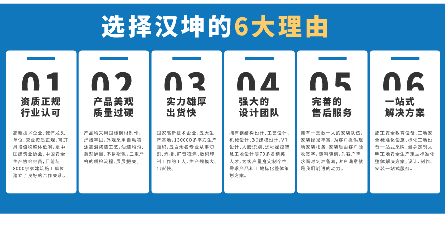 湖南汉坤实业有限公司是一家集施工安全标化产品研发生产、施工安全教育培训软件开发、智能智造硬件与环保绿色建材研发及生产于一体的高新技术企业,简称“汉坤实业”。致力于为客户打造3A、省优、鲁班奖等文明工地,提供策划设计、产品制造、现场施工一站式整体解决方案与服务。旗下有湖南汉坤实业有限公司、湖南翰坤实业有限公司、湖南金色畅联科技有限公司等子公司,现拥有“汉坤”“汉坤实业” “汉坤建筑”等注册商标。与中国建筑、中国铁建、中国中铁等8000余家知名建筑企业建立良好的业务关系,已经助力客户打造10000多个安全文明标准化工地。
