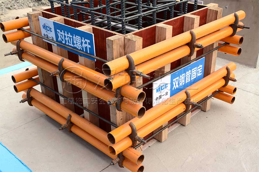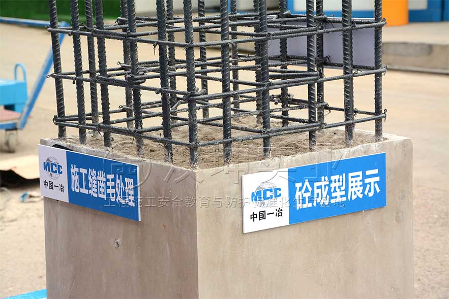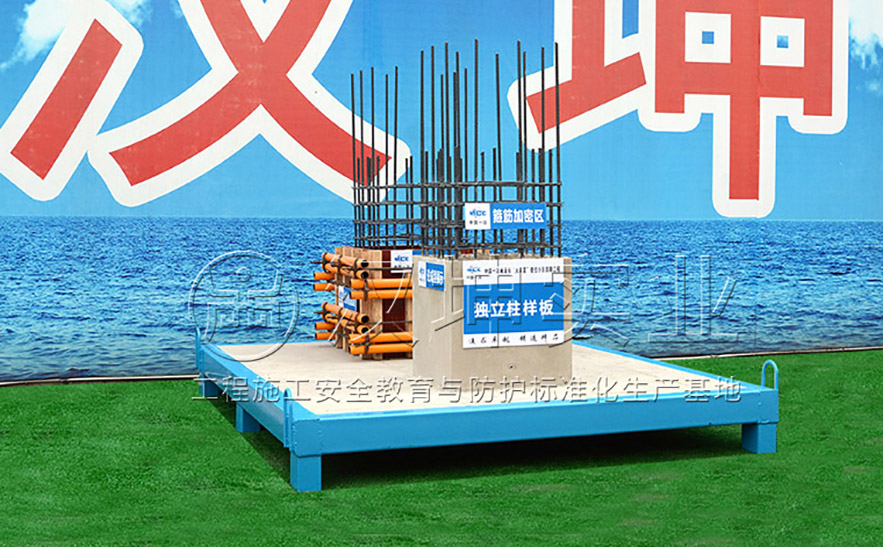 质量样板展示区-独立柱样板展示:柱钢筋绑扎、柱模板加固、双钢管固定、双螺帽加固、对拉螺杆、砼成型展示、施工缝凿毛处理、控制线弹墨线、箍筋加密区。