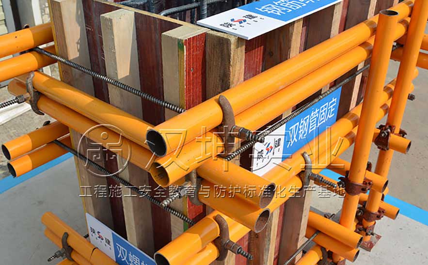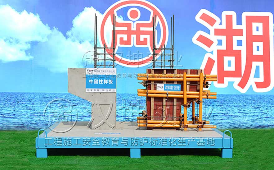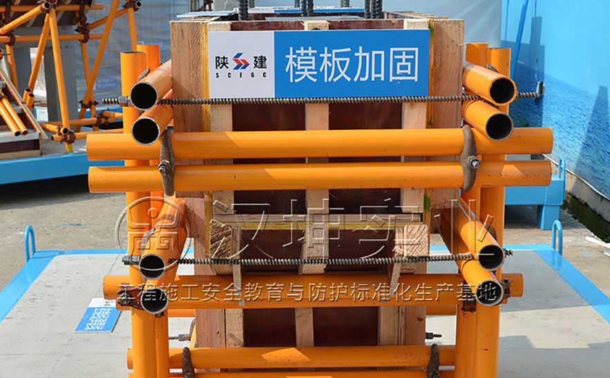 展示区:钢筋绑扎,模板加固,双钢管固定,双螺帽加固,砼成型,施工缝凿毛处理,控制线弹墨线,预埋件。