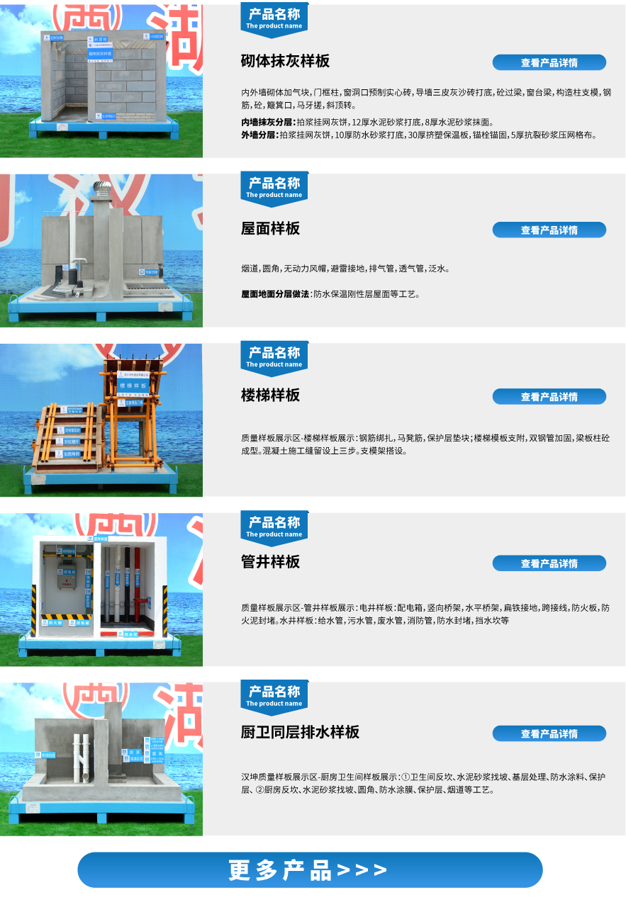 主体结构样板是汉坤质量样板展示区的热销产品之一,是是施工单位展示在本工程所用的材料及其质量、施工工艺、施工流程、技术水平及施工。样板可根据施工单位的图纸和需求量身定制。